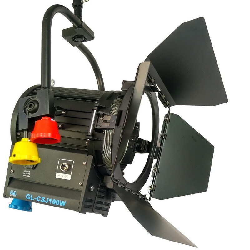 GL-CSJ100WS LED Fresnel é projetado para estúdio e iluminação de videógrafos, construído com alumínio, design clássico e compacto, garantindo a máxima saída de luz e leveza.que oferece uma alta reprodução de cores (média CRI > 92) e TLCI 94, pode ser controlado via Pole operador ou DMX ou controle manual sobre a luz. alta potência de saída de luz e auto-refrigeração sem ventilador e ruído. é absolutamente Studio amigável.
